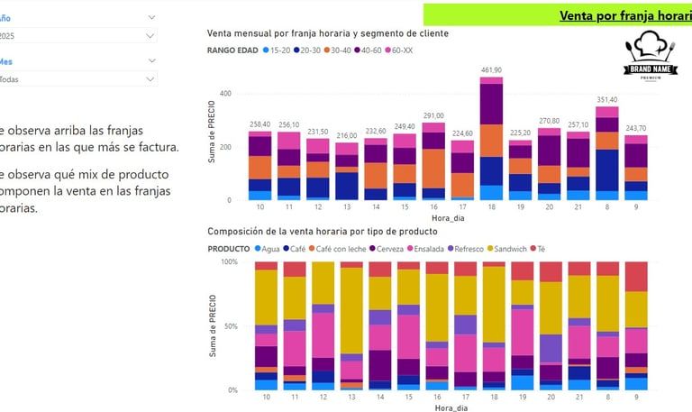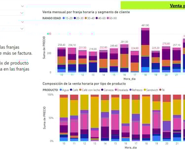 A través de un cuadro de mandos, se recopila información valiosa sobre las franjas horarias en las que los productos son más solicitados, segmentando la data por tipo de consumidor, género y edad.
